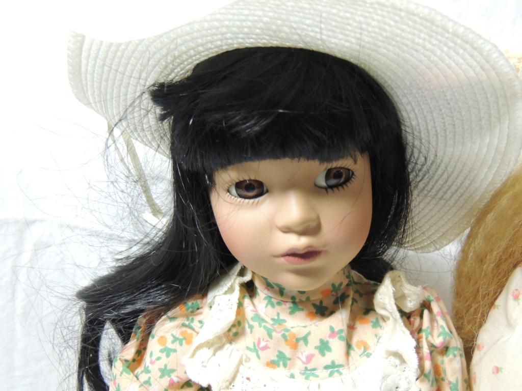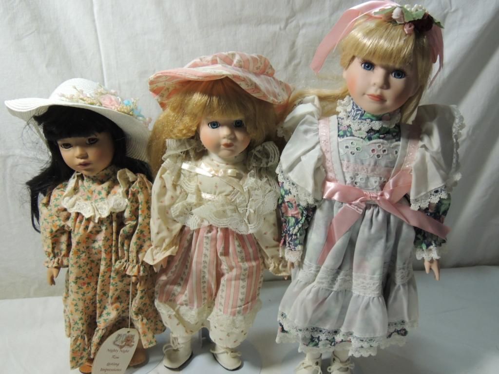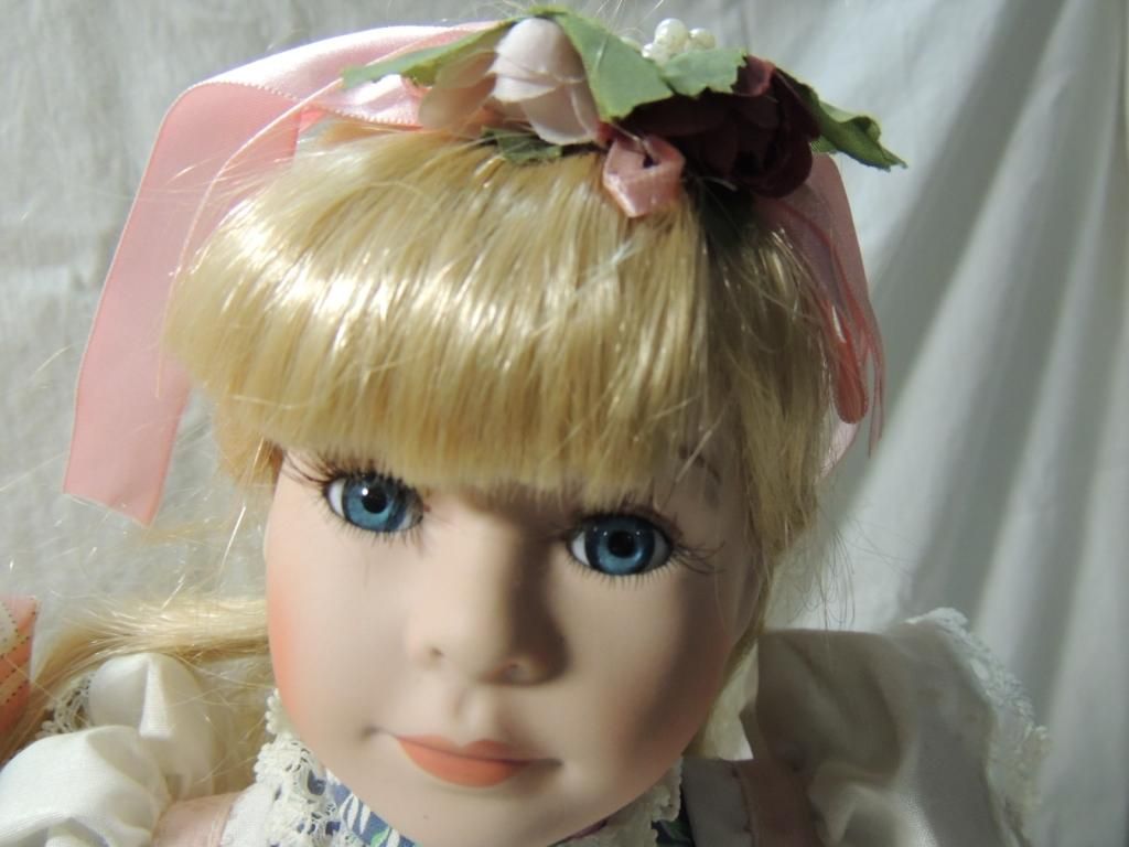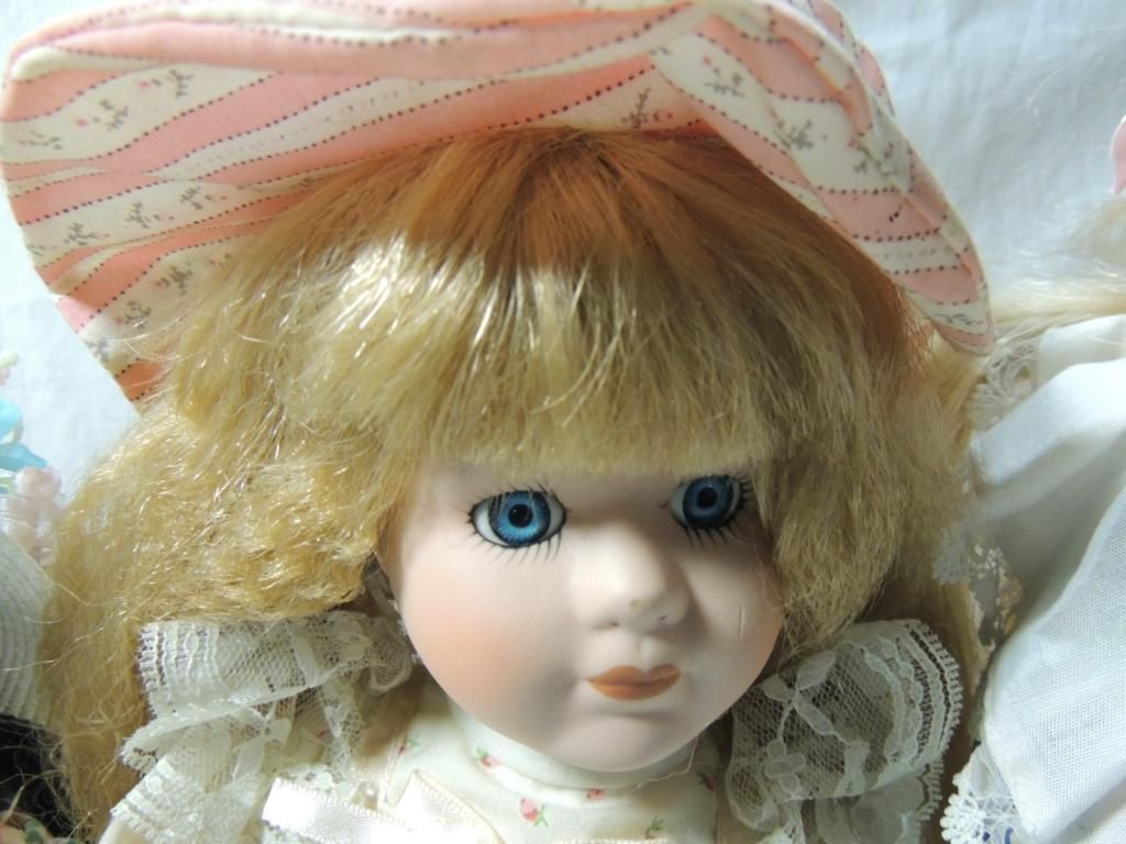 NIGHTY NIGHT DOLL, FLORAL DRESSES. RIBBONS, STRAW HAT WITH FLOWERS. APRON, LONG HAIR. ON STAND. PORCELAIN DOLLS ON STANDS BEAUTIFUL. COLLECTIBLE. DOLLS. AS SHOWN. SEE PHOTO FOR MORE DETAILS.