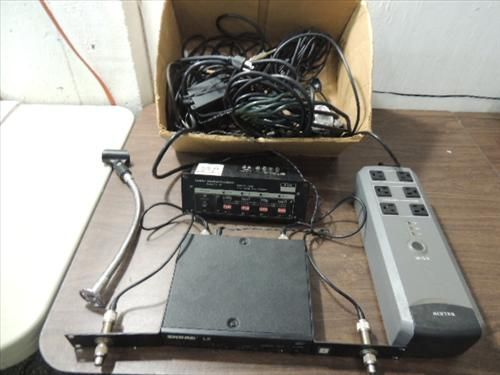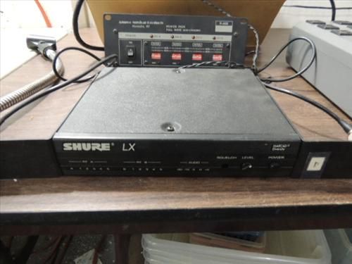 LOT 3 ELECTRONICS & CABLES: AMPCO 4 CHANNEL POWER PACK P-406, SHURE LX AUDIO DIVERSITY & SURGE & BACK UP POWER STRIP. AS SHOWN. VIEW PICTURE FOR DETAIL.