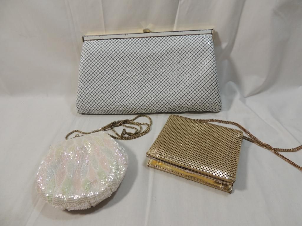 WHITE LARGE METAL MESH CLUTCH. SMALL GOLD LONG STRAP PURSE. WHITE BEADED EVENING PURSE BAG. AS SHOWN. SEE PHOTO FOR MORE DETAILS.