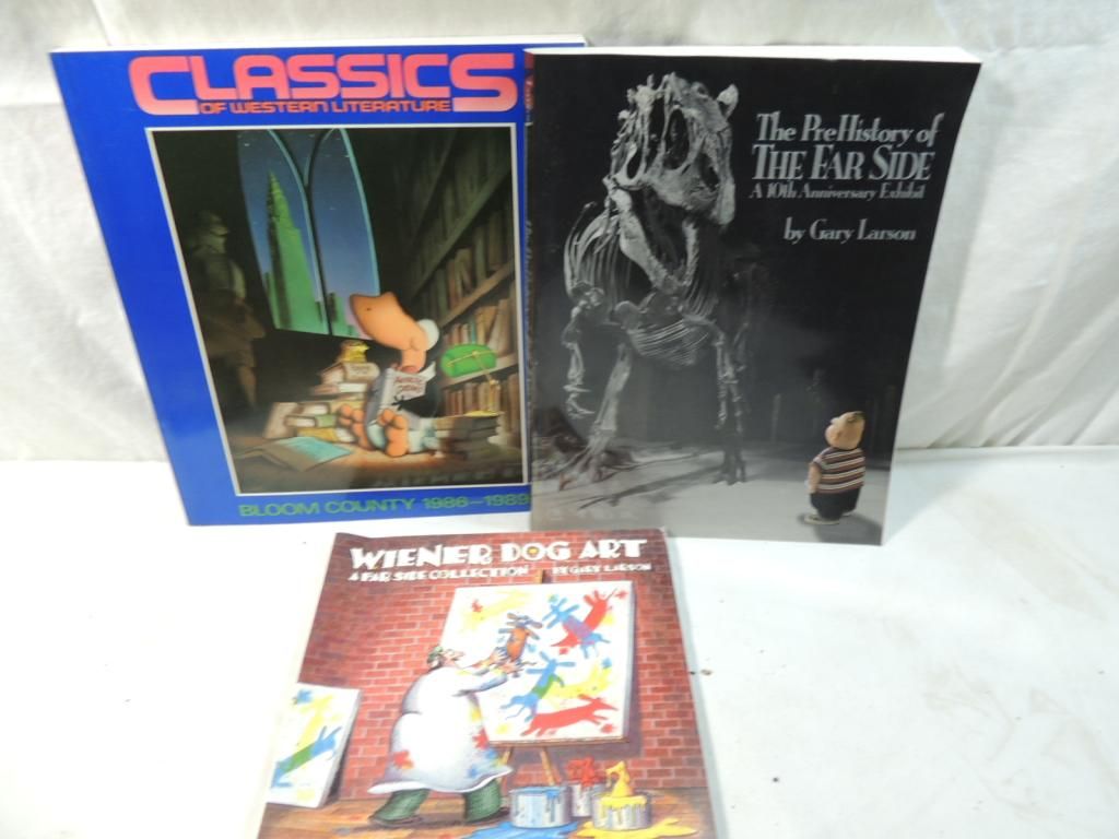 WIENER DOG ART A FAR SIDE COLLECTION, THE PREHISTORY OF THE FAR SIDE A 10TH ANNIVERSARY EXHIBIT CLASSICS OF WESTERN LITERATURE BLOOM COUNTY 1986-1989. COMIC STRIP BOOKS AS SHOWN SEE PHOTO FOR MORE DETAILS.