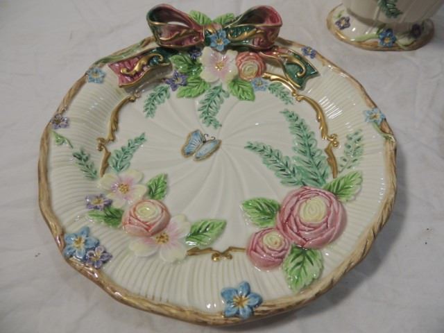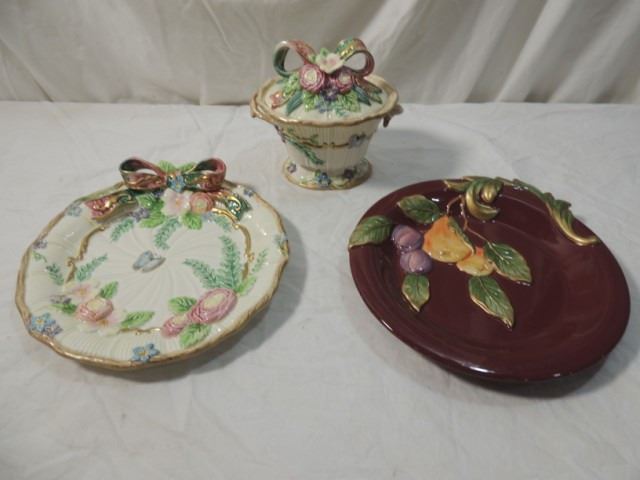 TWO PLATTERS AND COVERED BOWL, SUGAR OR OTHERWISE. NO CHIPS OR CRACKS. AS SHOWN. PLATES ARE ABOUT 10" DIAMETER.