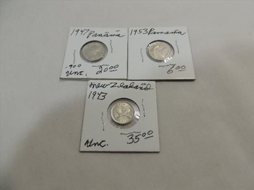 LOT 3 FOREIGN SILVER COINS PANAMA 1947 & 53 10 CINCUENTENARIO. & NEW ZEALAND 1943 3 PENCE. AS SHOWN. VIEW PICTURE FOR DETAIL.