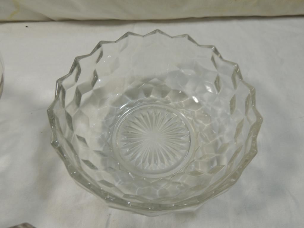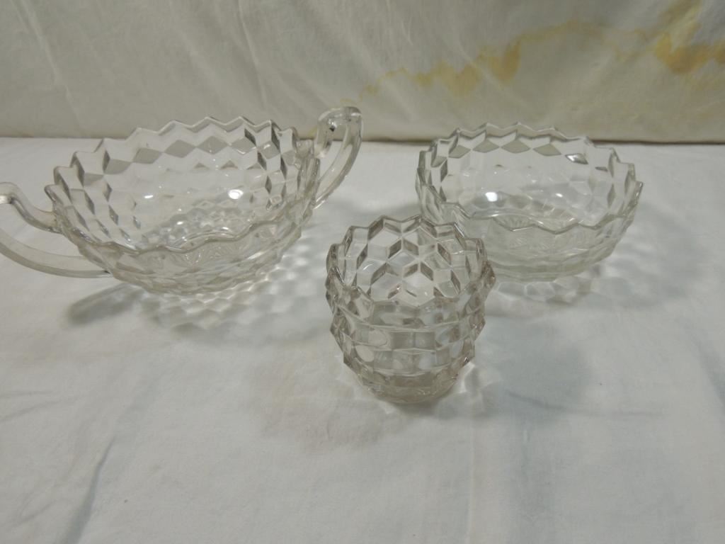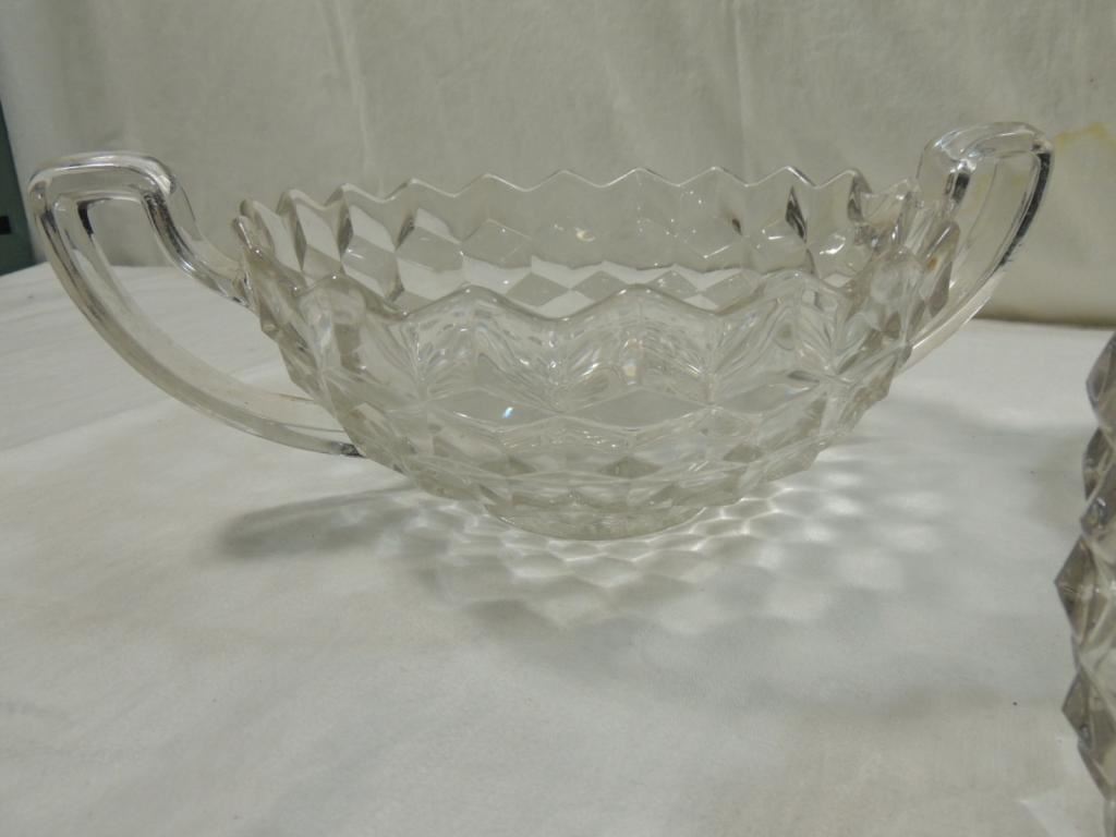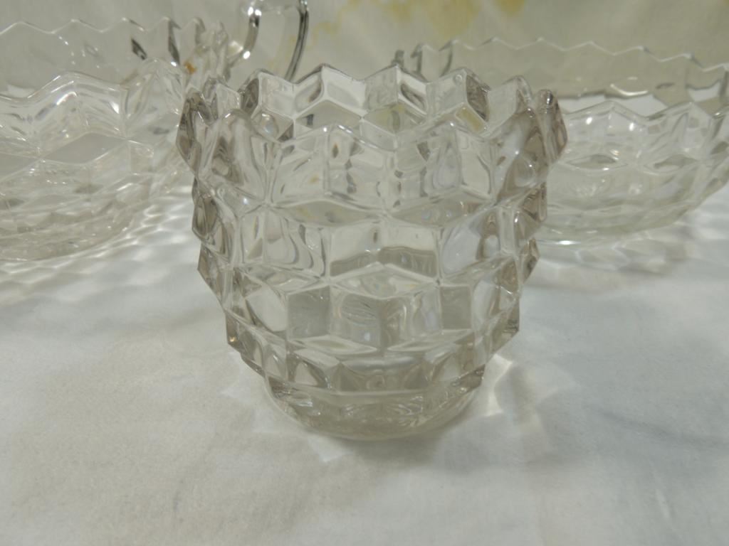 CUBE PATTERN, AMERICAN PATTERN, CLEAR GLASS, VINTAGE GLASS, COLLECTIBLE GLASSWARE, DOUBLE HANDLE BOWL, SMALLER BOWL, DECORATIVE AS SHOWN SEE PHOTO FOR MORE DETAILS.