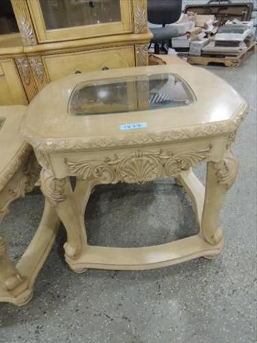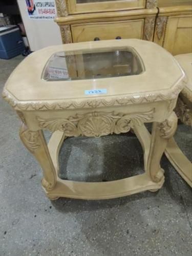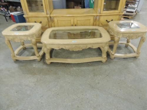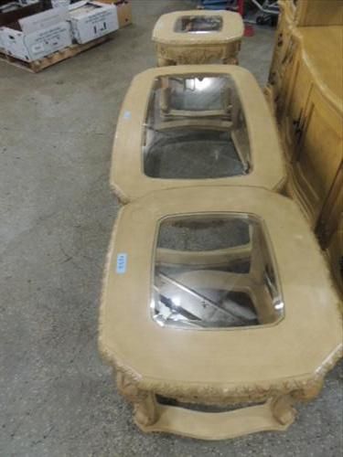 LOT 3 FRENCH PROVINCIAL FURNITURE: 1 COFFEE TABLE 52"LX32"WX20"H BEVELED GLASS TOP & 2 END TABLES 27"WX25"DX25"H. BEVELED GLASS TOPS. AS SHOWN. VIEW PICTURE FOR DETAIL.