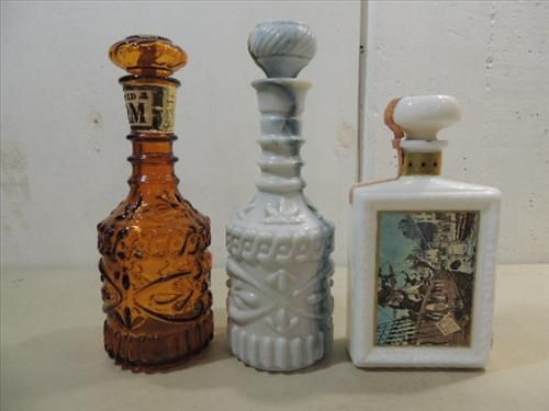 LOT 3 GLASS 1970S (2) JIM BEAM DECANTERS & 1 JW DANT'S KENTUCKY BOURBON BOTTLE.  AS SHOWN.  VIEW PICTURE FOR DETAIL.
