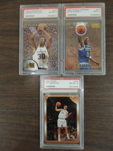 LOT 3 GRADED BASKETBALL CARDS: 1995 FLEER #208, 1996 SKYBOX #67 & 1998 TOPPS #154. AS SHOWN. VIEW PICTURE FOR DETAIL.