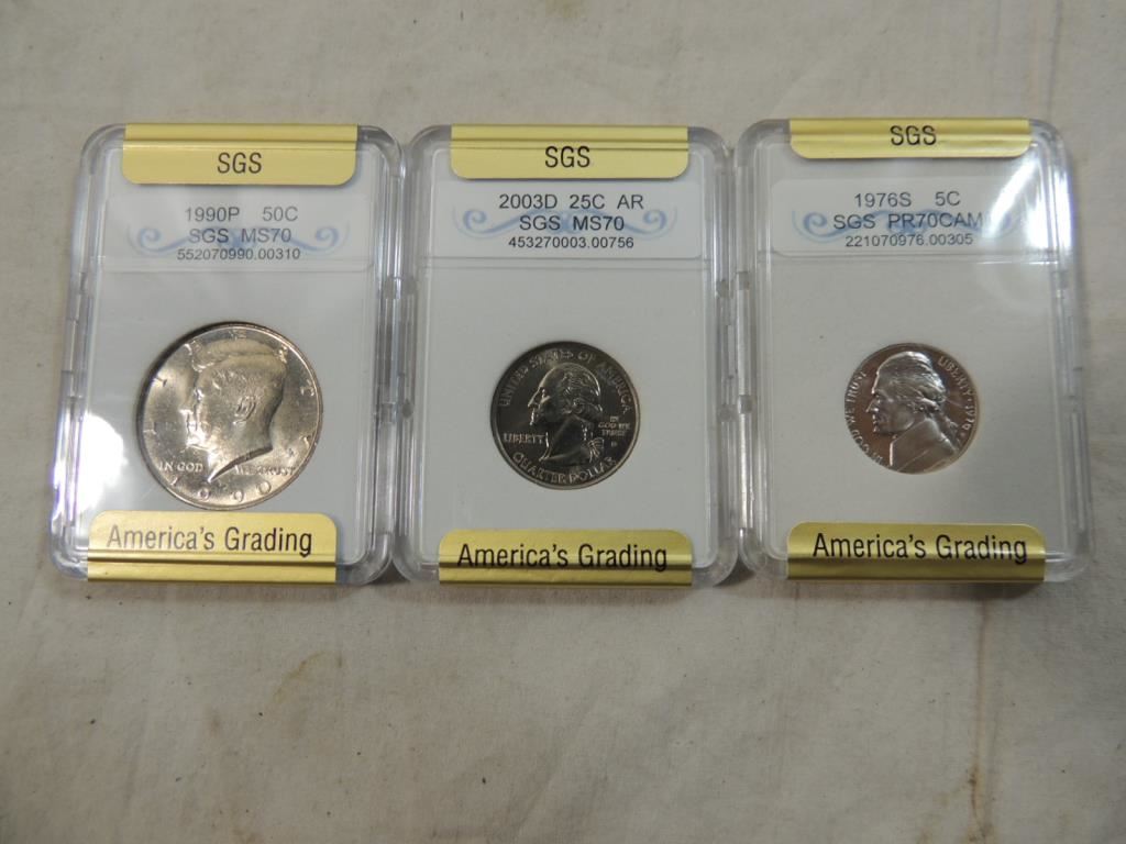 1979S 5C, 2003D 25C, 1990P 50C, AMERICAS GRADING SGS, COIN COLLECTIBLES, CURRENCY COLLECTIBLE, UNITED STATES COIN COLLECTIBLE, COIN COLLECTORS, AS SHOWN SEE PHOTO FOR MORE DETAILS