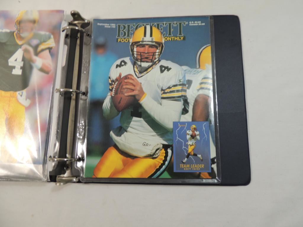 BINDER FOOTBALL PLAYER COLLCETIBLE. PACKER PROFILES MAGAZINE, BRETT FAVRE MAGAZINE, BECKETT WITH BRETT FAVRE COVER AS SHOWN SEE PHOTO FOR MORE DETAILS.