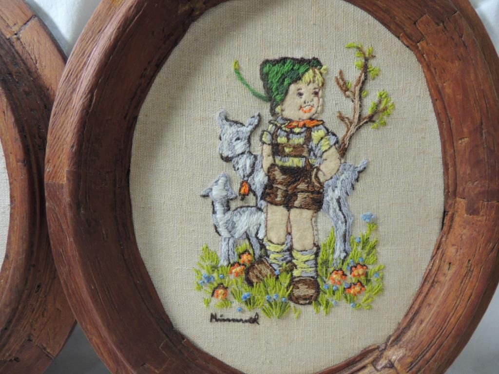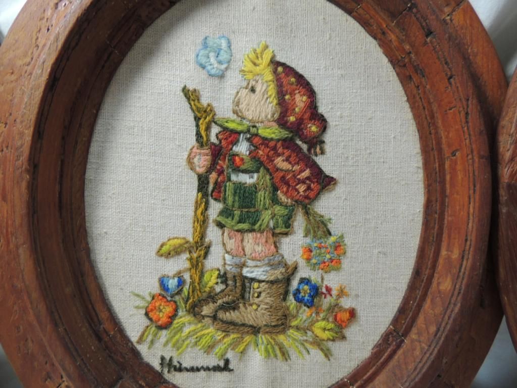 GERMAN? HUMMEL NEEDLEPOINT BOY AND GIRL NEEDLE POINT FRAMED ART. VTG ESTATE LOT NEEDLEPOINT CREWEL EMBROIDERED HUMMEL FRAMED PICTURE PLAQUE SET VINTAGE NEEDLE POINT. AS SHOWN.SEE PHOTO FOR MORE DETAILS.