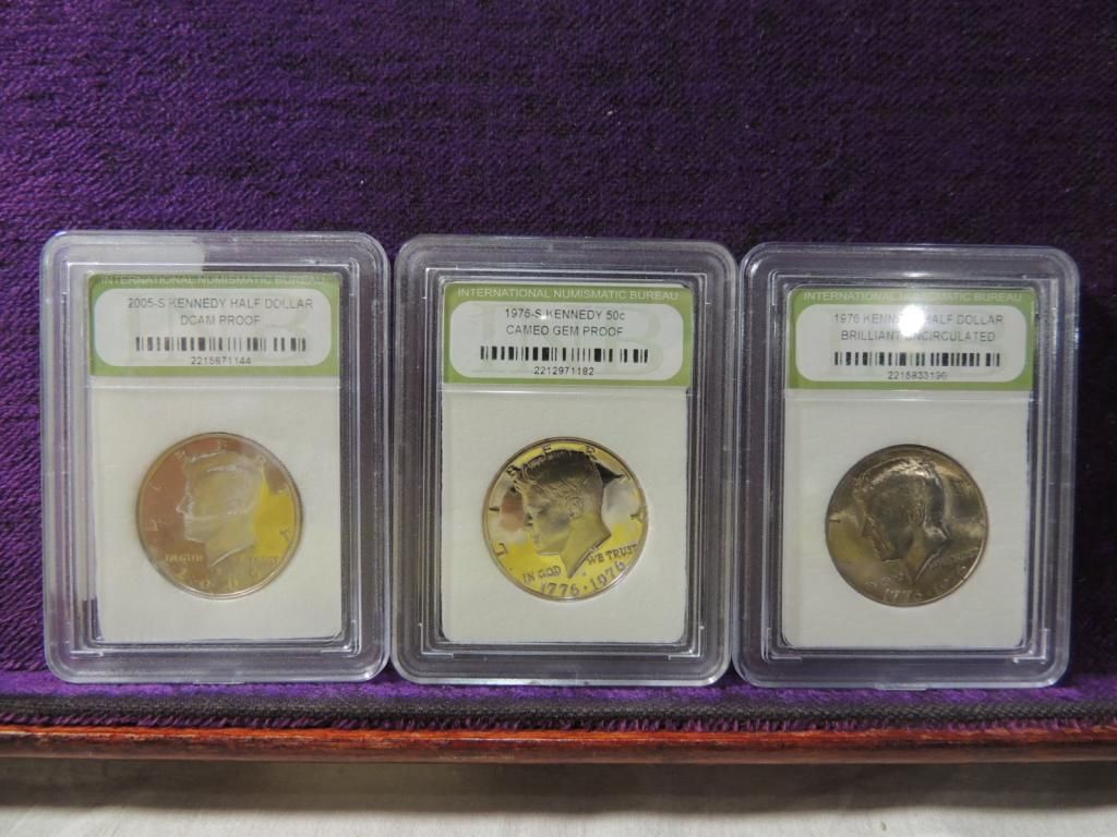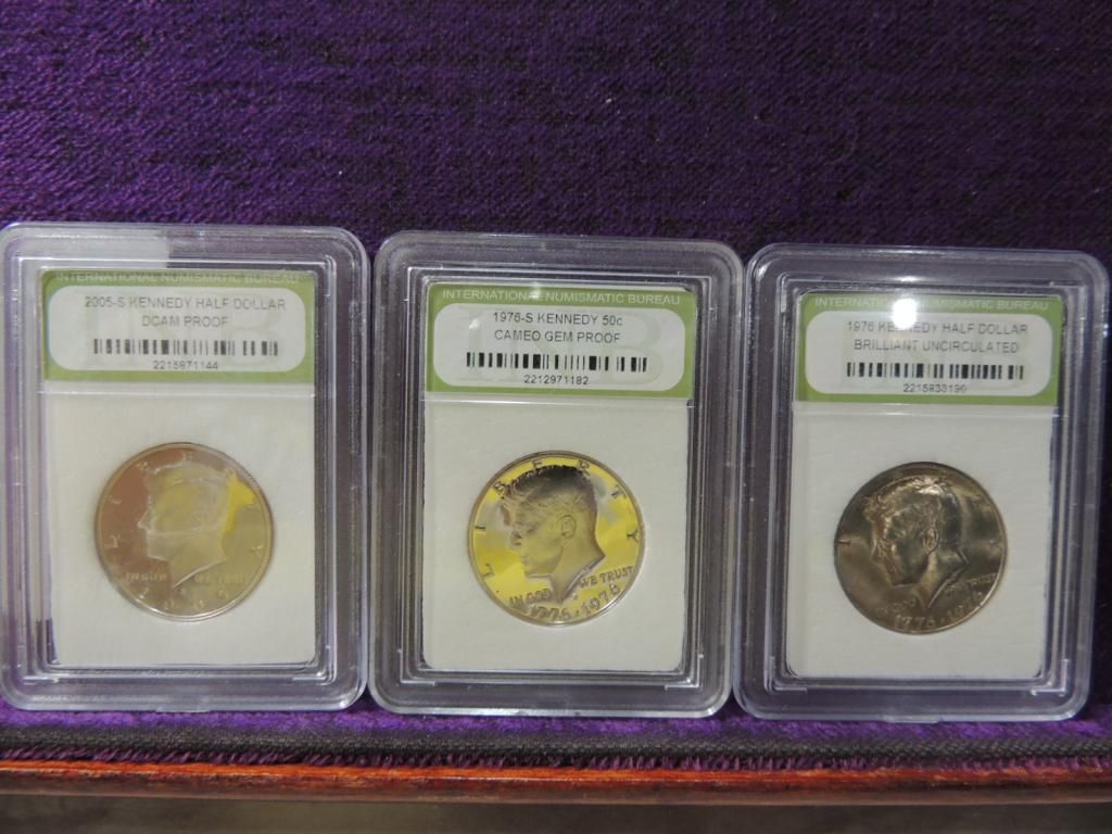 1978 S KENNEDY , 1976 KENNEDY HALF DOLLAR, 2005 S KENNEDY HALF DOLLAR. CERTIFIED COINS. INTERNATIONAL NUMISMATIC BUREAU SEALED GRADED COIN. GOOD CONDITION. GENUINE COIN. US CURRENCY. COIN COLLECTIBLE. MONEY COLLECTIBLE. PROTECTIVE CASE. AS SHOWN. SEE PHOT