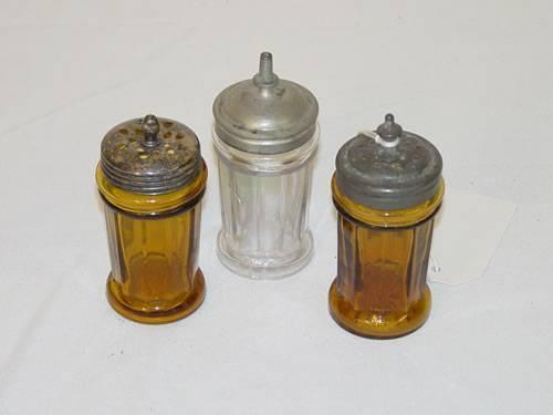 LOT (3) LARGE SANDWICH PANELED CHRISTMAS SALTS: (2) AMBER & (1) CLEAR - NO AGITATORS, WEAR & DENTS TO LID;