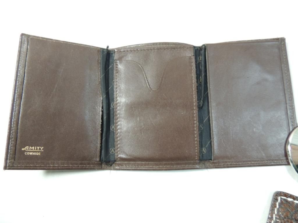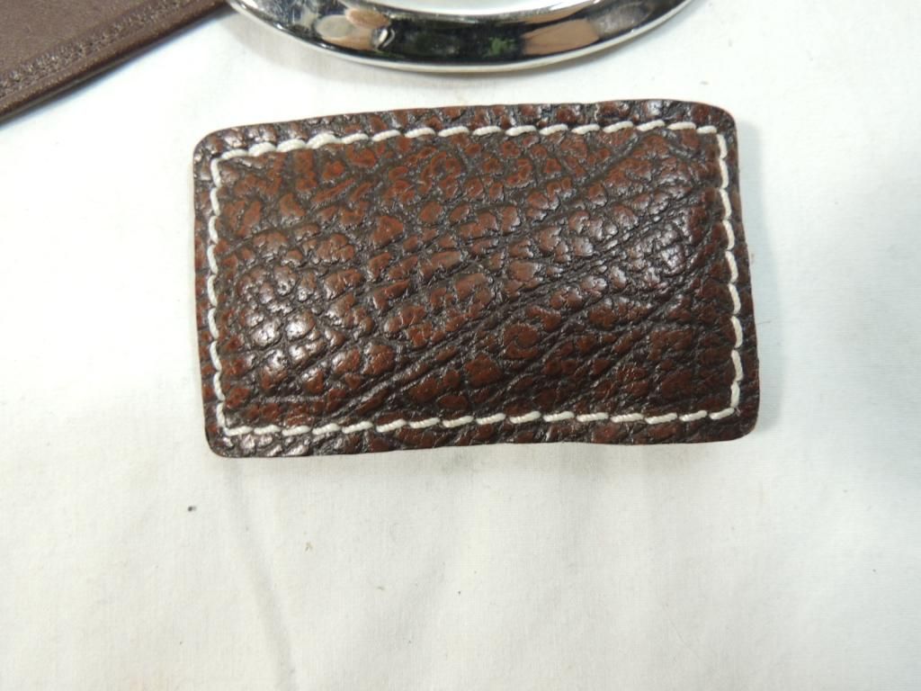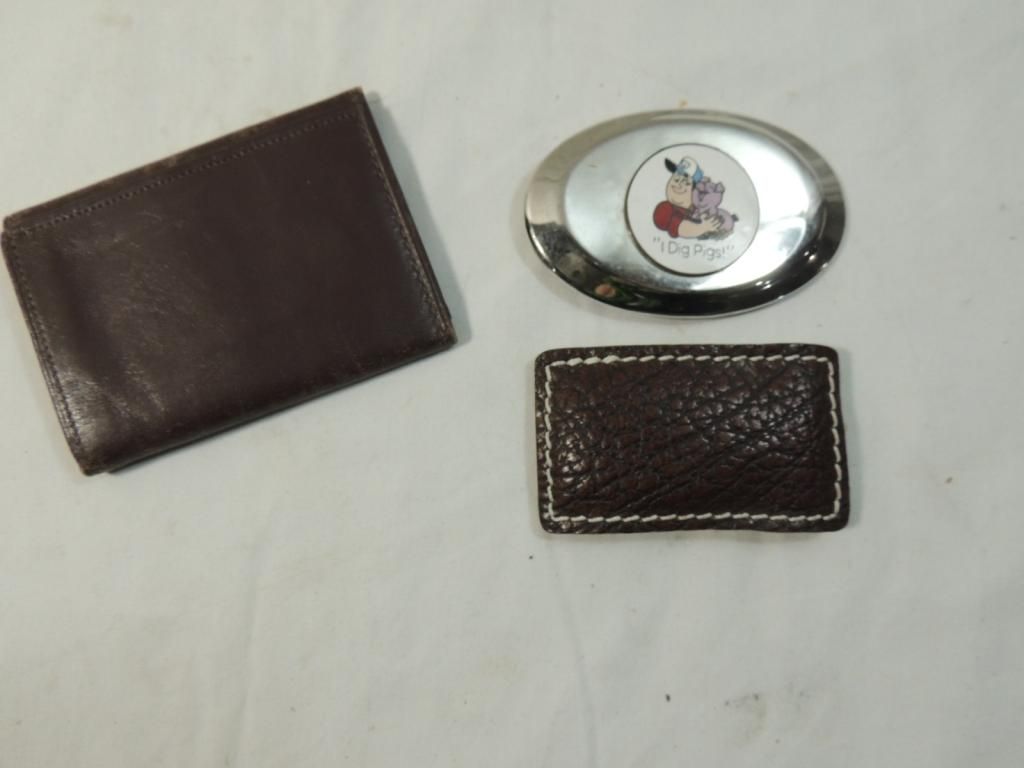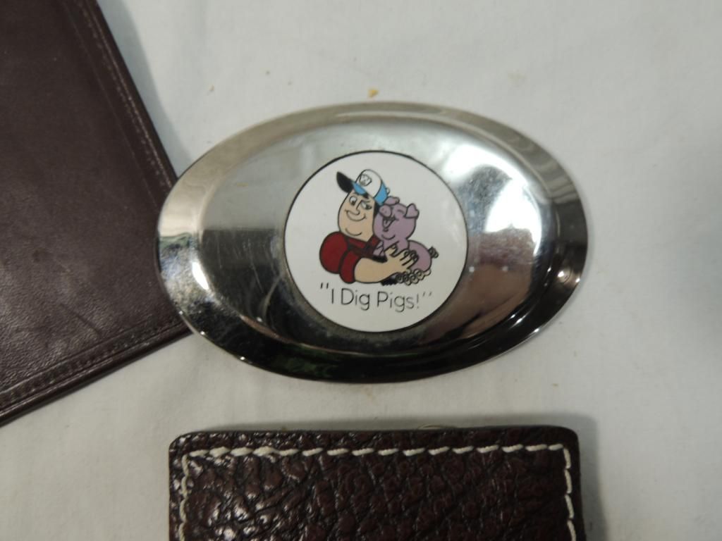 LEATHER COW HIDE WALLET. LEATHER BELT BUCKLE. METAL BELT BUCKLE WITH "I DIG PIGS" LOGO. AS SHOWN SEE PHOTO FOR MORE DETAILS.
