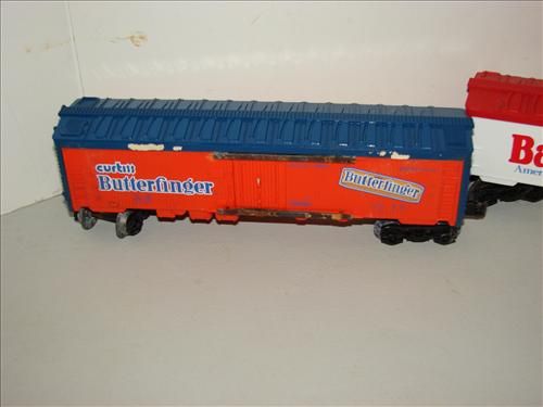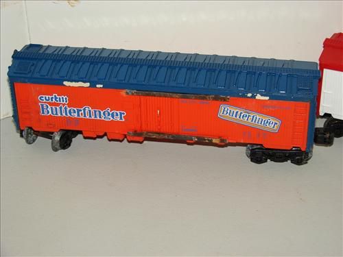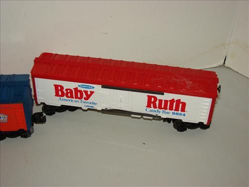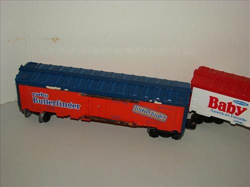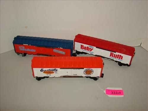 LOT INCLUDES: LIONEL BABY RUTH BOXCAR (O SCALE), LIONEL BUTTERFINGER BOXCAR (O SCALE), AND LIONEL GOLD MEDAL FLOUR BOXCAR (O SCALE). AS SHOWN. VIEW PICTURE FOR DETAIL.