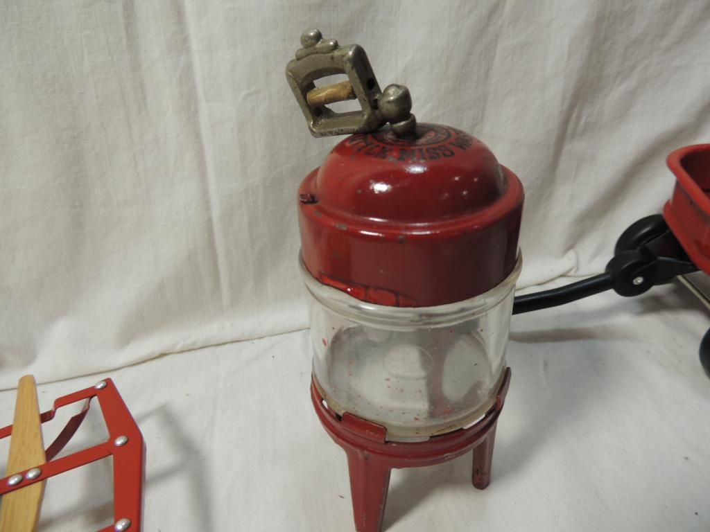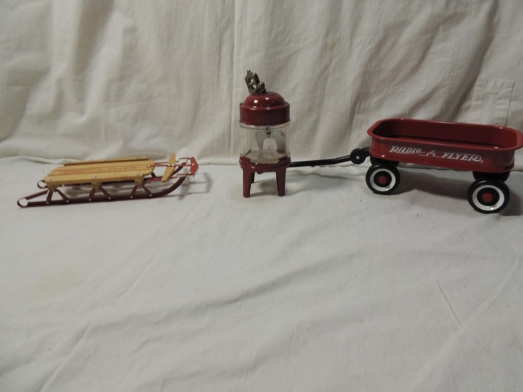 LOT 3 MINITURE VINTAGE WAGON, SLED, WASHER
