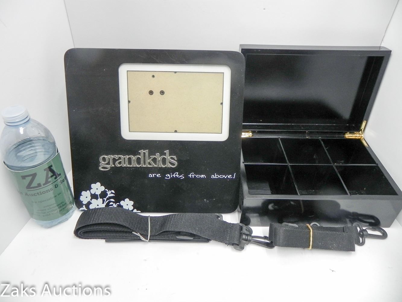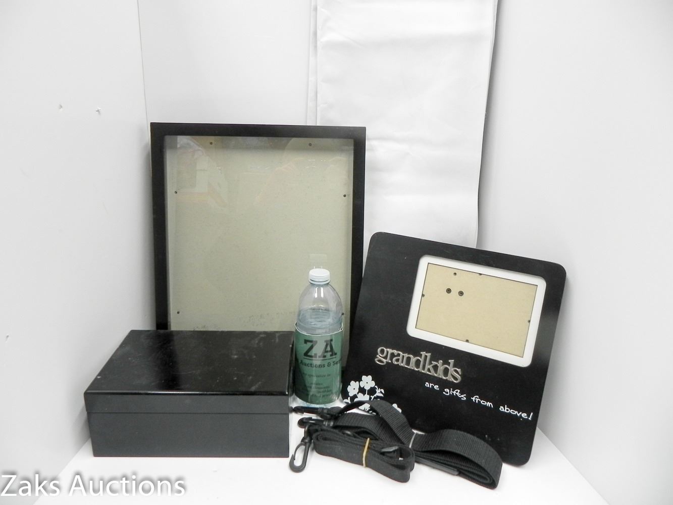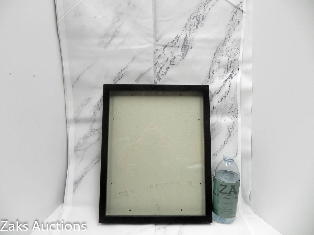 LOT 3: MISC ESTATE LOT. 11X14 PICTURE FAMRE, STRAPPING BOX AND LARGE MARBLE PHOTO BACKDROP