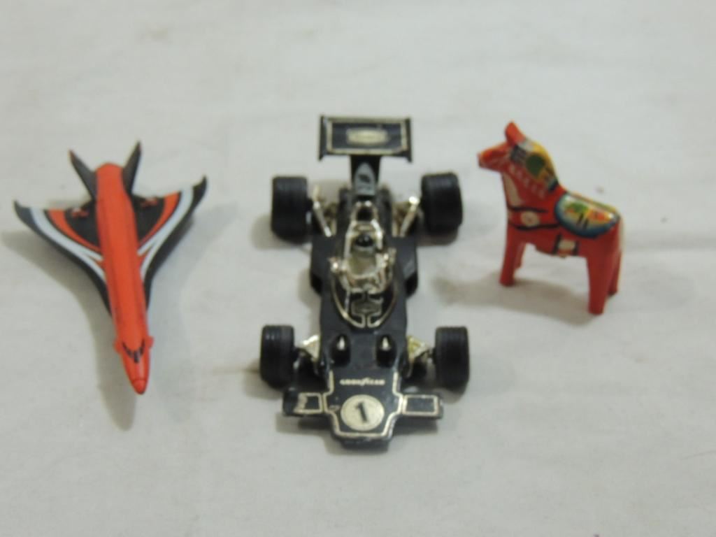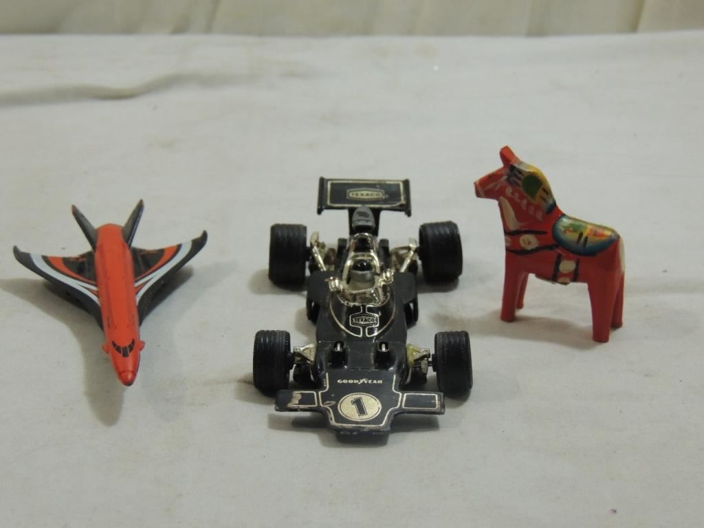 MATCHBOX JET PLANE, TEXACO RACE CAR, WOODEN DECORATIVE HORSE, AS SHOWN SEE PHOTO FOR MORE DETAILS.
