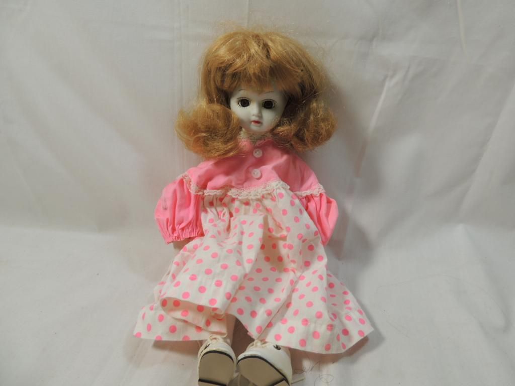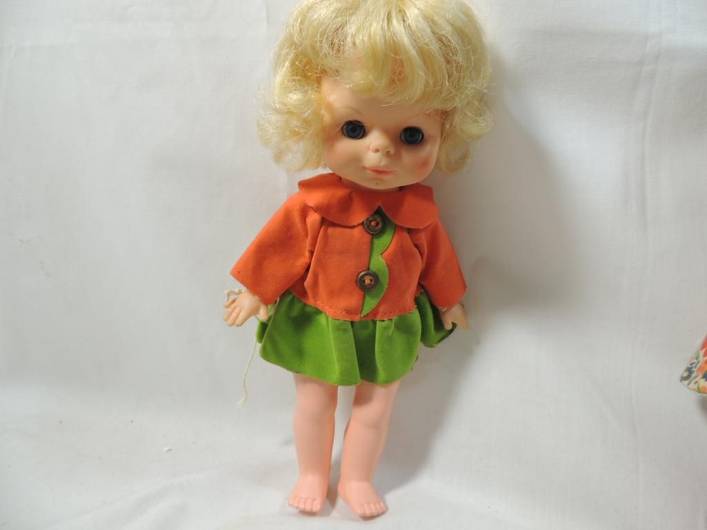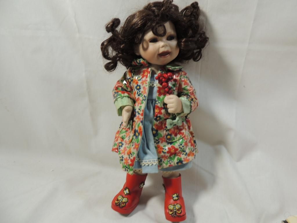 VINTAGE PLASTIC DOLL. MARIE OSMOND DOLL "GIRLS WILL BE SPRING" PORCELAIN DOLL IN RAIN FLORAL RAIN COAT. WHITE PORCELAIN DOLL. AS SHOWN SEE PHOTO FOR MORE DETAILS.