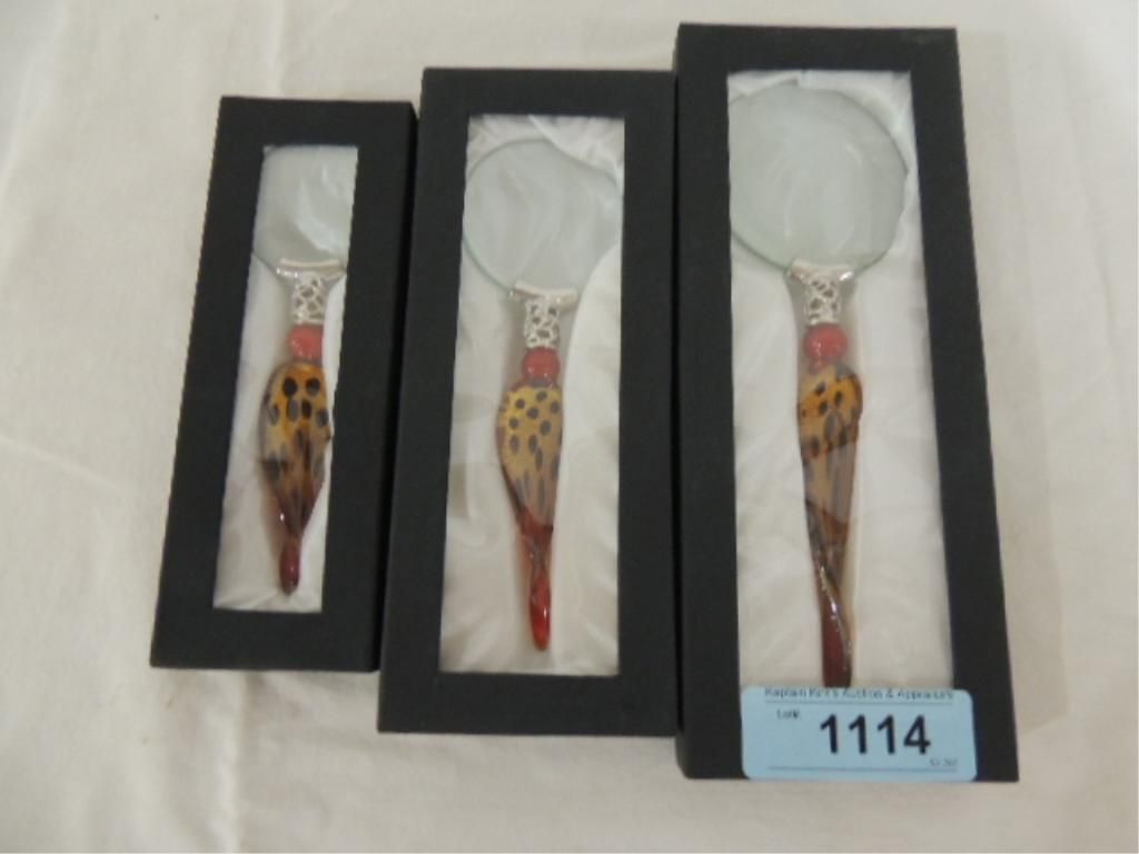 LOT 3 MURANO STYLE GLASS HANDLE HAND HELD MAGNIFYING GLASSES IN THREE SIZES. 8", 7", 6" AS SHOWN. VIEW PICTURE FOR DETAIL.