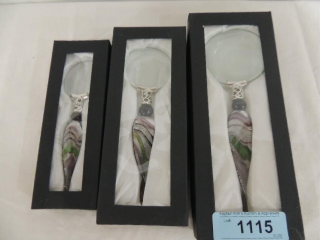 LOT 3 MURANO STYLE GLASS HANDLE HAND HELD MAGNIFYING GLASSES IN THREE SIZES. 8", 7", 6" AS SHOWN. VIEW PICTURE FOR DETAIL.