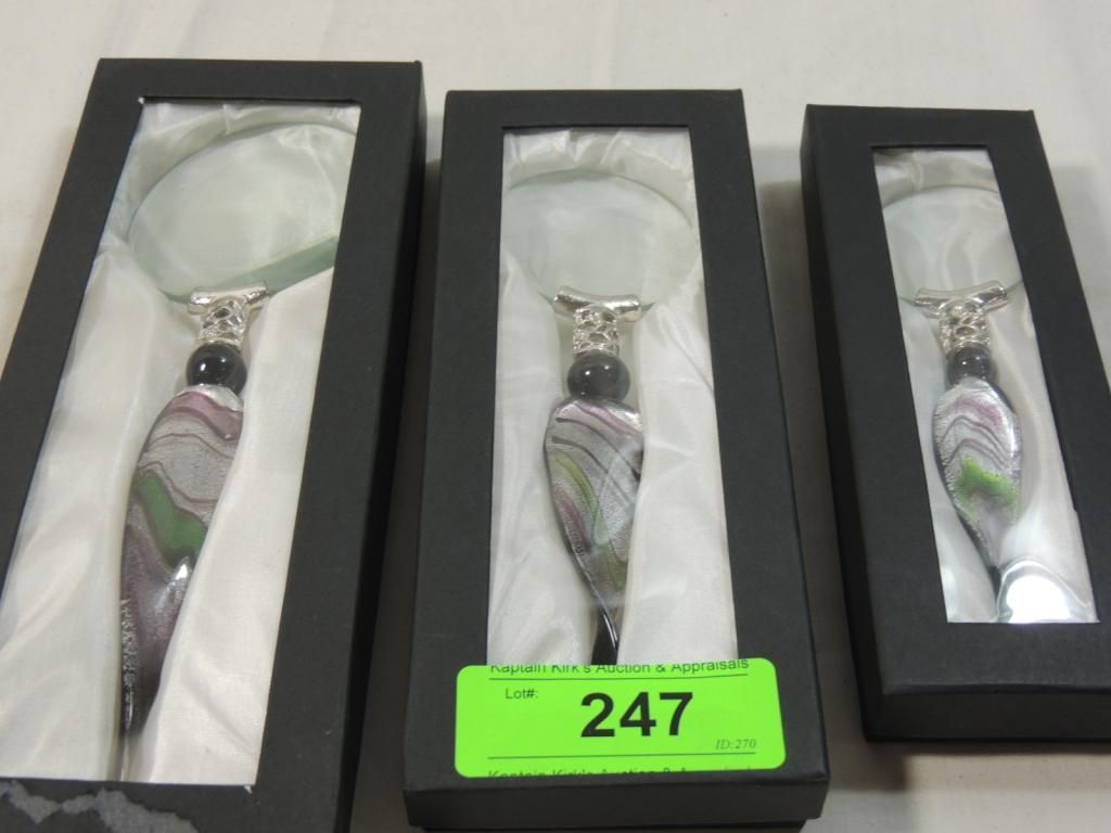 LOT 3 MURANO STYLE GLASS HANDLE HAND HELD MAGNIFYING GLASSES IN THREE SIZES. 8", 7", 6" AS SHOWN. VIEW PICTURE FOR DETAIL.