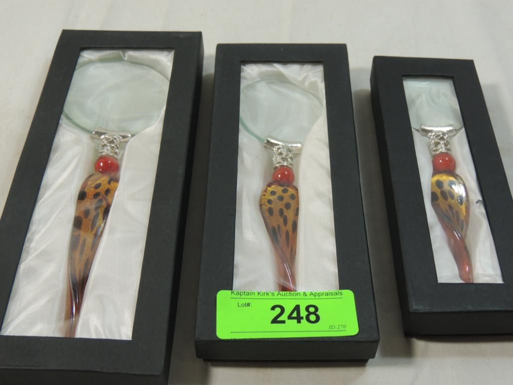 LOT 3 MURANO STYLE GLASS HANDLE HAND HELD MAGNIFYING GLASSES IN THREE SIZES. 8", 7", 6" AS SHOWN. VIEW PICTURE FOR DETAIL.