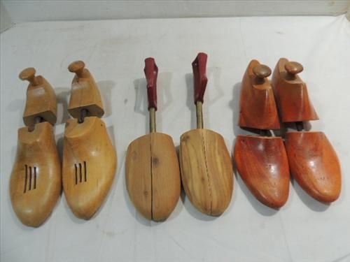 LOT 3 PAIR VINTAGE WOODEN SHOE FORMS OR STRETCHERS. AS SHOWN. VIEW PICTURE FOR DETAIL.