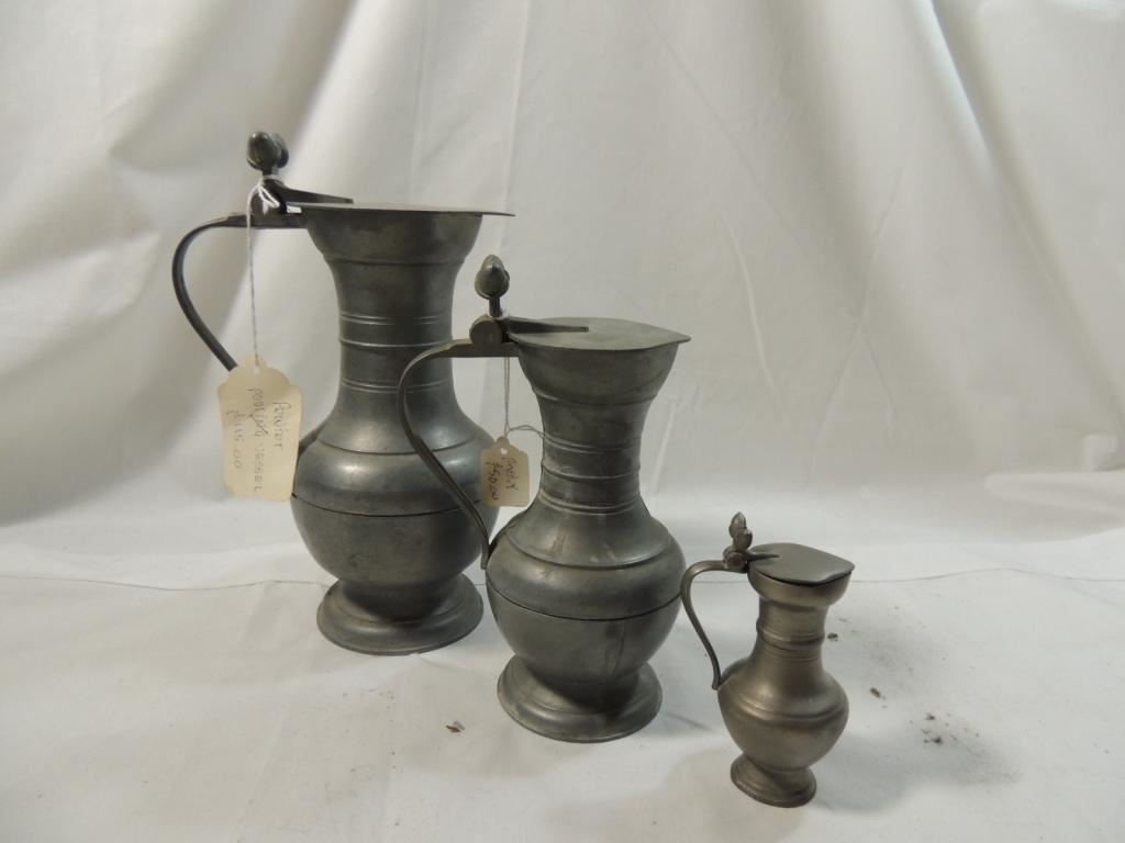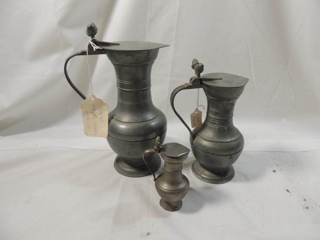 LOT 3 PEWTER LIDDED POURING VESSEL JUG PITCHER CREAMER SYRUP AS SHOWN SEE PHOTO FOR MORE DETAILS