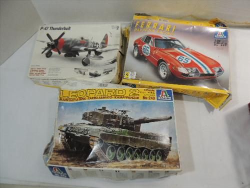 LOT 3 PLASTIC MODEL KITS: WWII GERMAN TANK, FERRARI CAR & WWII P-47 THUNDERBOLT FIGHTER PLANE. BOXES ARE IN ROUGH CONDITION. AS SHOWN. VIEW PICTURE OFR DETAIL.