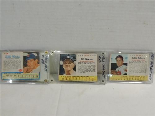 LOT 3 POST CEREAL BASEBALL CARDS: 1963 #66 ROBERTS, 1963 #12SKOWRON & 1962 #84 MARTIN. AS SHOWN. VIEW PICTURE FOR DETAIL.