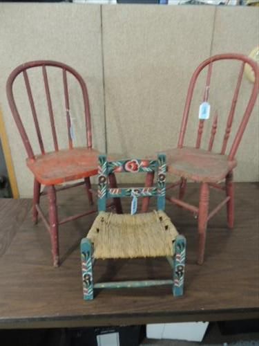 LOT 3 PRIMITIVE CHILD'S CHAIRS: 2 HOOP BACK (BENT WOOD) & 1 HAND PAINTED CAINED CHAIR. AS SHOWN. VIEW PICTURE FOR DETAIL.