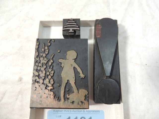 LOT OF THREE PRINT BLOCKS. LITTLE GIRL PLAYING WITH HER DOG, EXCLAMATION POINT, AND SMALL CHRISTMAS TREE PINE EVERGREEN TREE. ALL FOR ONE MONEY. AS SHOWN.