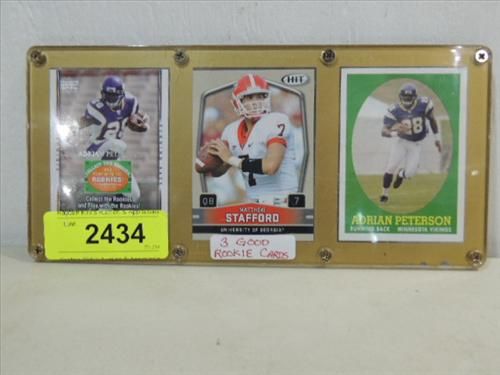LOT 3 ROOKIE FOOTBALL CARDS: (2) ADRIAN PETERSON, MATTHEW STAFFORD. AS SHOWN. VIEW PICTURE FOR DETAIL.