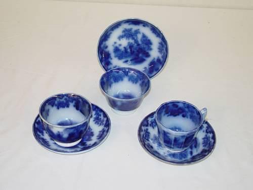 LOT (3) SCINDE FLOW BLUE CUPS & SAUCERS BY ALCOCK: (2) HANDLESS & (1) W/ HANDLE - (1) SAUCER W/ REPAIRED CHIP & (2) CUPS W/ MINOR CHIPS & WEAR;