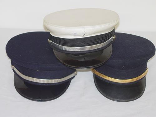 LOT (3) SOFT TOP UNIFORM DRESS CAPS: (2) BLUE WOOL & (1) WHITE LEATHER - NORMAL WEAR;