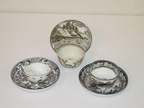 LOT (3) STAFFORDSHIRE TRANSFERWARE HANDLESS CUPS & SAUCERS (VARIOUS ENGLISH RURAL SCENES) W/ SEPIA TONES & BLUE BORDERS - (1) CUP CRACKED, WEAR;