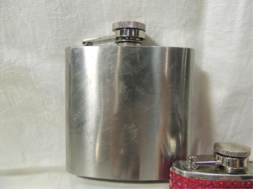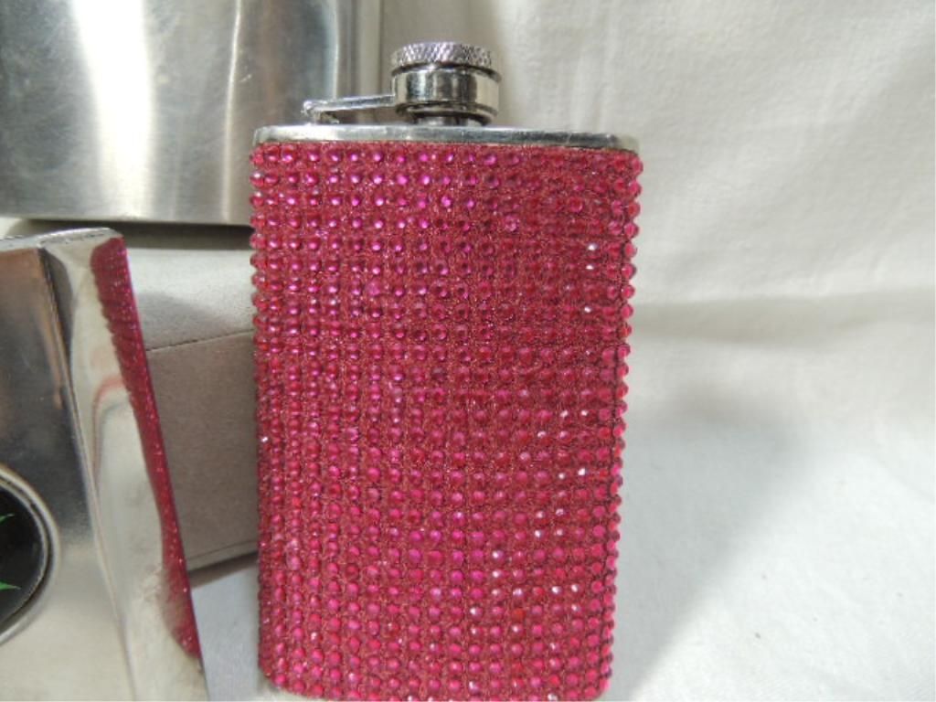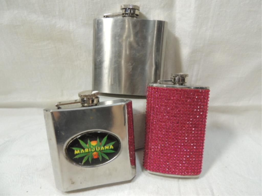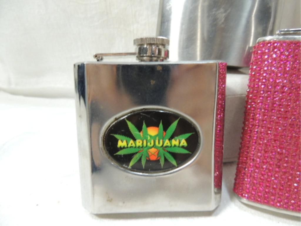 PLAIN STAINLESS STEEL 6 OZ, STAINLESS STEEL 6 OZ WITH MARIJUANA LOGO, STAINLESS STEEL 5OZ WITH HOT PINK RHINESTONES. AS SHOWN. SEE PHOTO FOR MORE DETAILS.