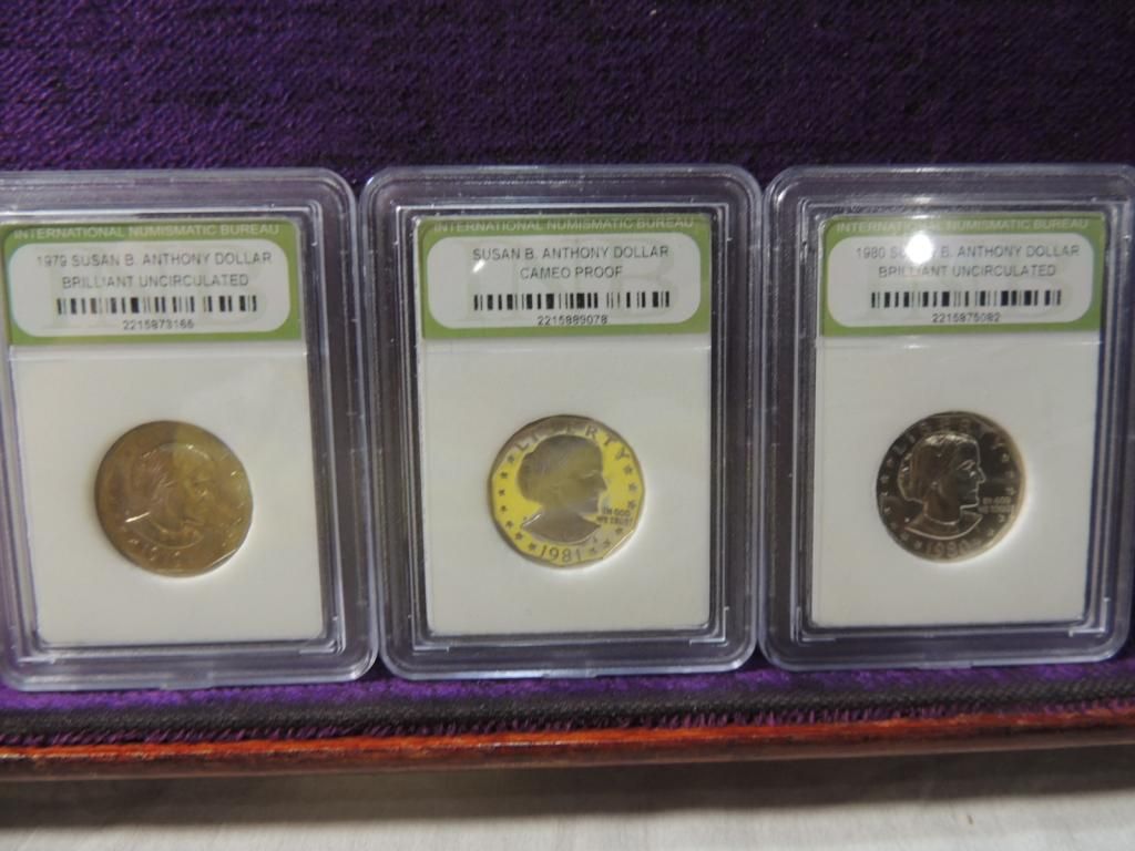 1979, 1980, 1981 SUSAN B ANTHONY CAMEO PROOF, BRILLIANT UNCIRCULATED. CERTIFIED COINS. INTERNATIONAL NUMISMATIC BUREAU SEALED GRADED COIN. GOOD CONDITION. GENUINE COIN. US CURRENCY. COIN COLLECTIBLE. MONEY COLLECTIBLE. PROTECTIVE CASE. AS SHOWN. SEE PHOTO