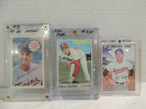 LOT 3 TOPPS $ KELLOGGS BASEBALL CARDS: 1967 #228 GIL HODGES, 1970 #230 STEVE CARLTON & 1970 #61 HARMON KILLEBREW. AS SHOWN. VIEW PICTURE FOR DETAIL.