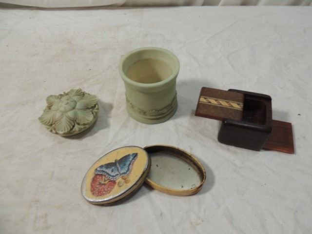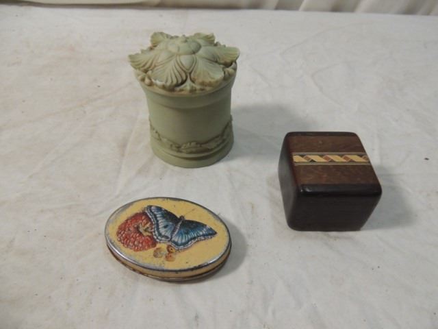 NICE LOT OF TRINKET BOXES. IRIS AND ORCHID DESIGN INC. WOOD SLIDE BOX AND METAL TIN BOX. AS SHOWN.