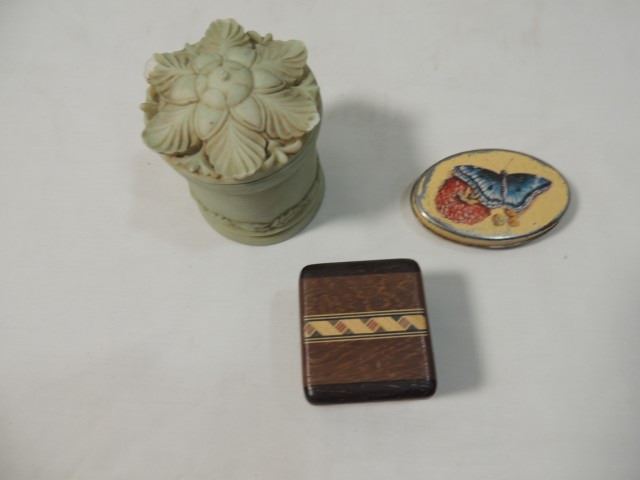 NICE LOT OF TRINKET BOXES. IRIS AND ORCHID DESIGN INC. WOOD SLIDE BOX AND METAL TIN BOX. AS SHOWN.