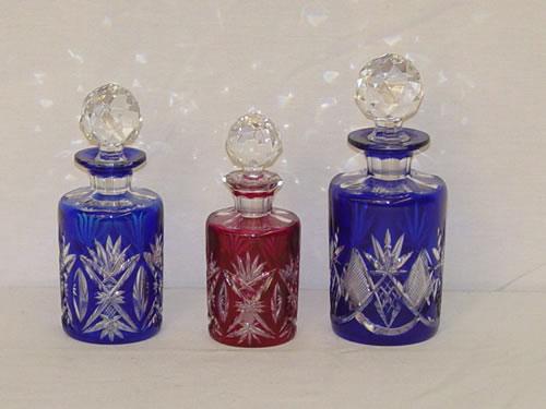 LOT (3) VAL ST. LAMBERT COLORED CUT GLASS COLOGNE BOTTLES W/ STOPPERS: 5 3/4" CRANBERRY CUT TO CLEAR- UNSIGNED, SM. CHIP TO BOTTOM OF STOPPER, 6 1/4" COBALT CUT TO CLEAR-UNSIGNED, SM. CHIP TO BOTTOM OF STOPPER, & 7" COBALT CUT TO CLEAR-SIGNED ON BOTTOM