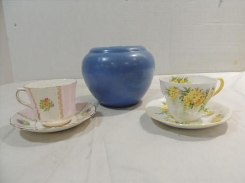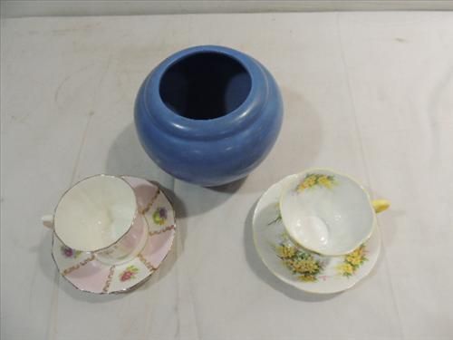 LOT 3 VINATGE ITEMS: (2) ROYAL ALBERY CHINA TEA CUPS & HAEGER BOWL OR PLANTER. AS SHOWN. VIEW PICTURE FOR DETAIL.