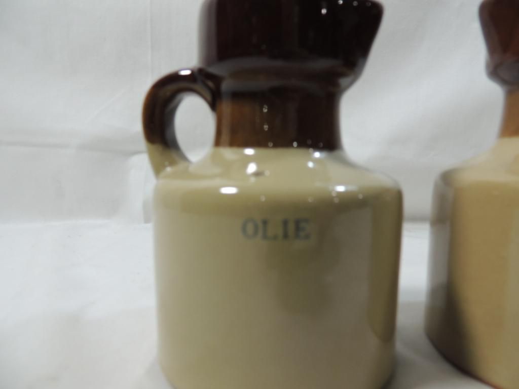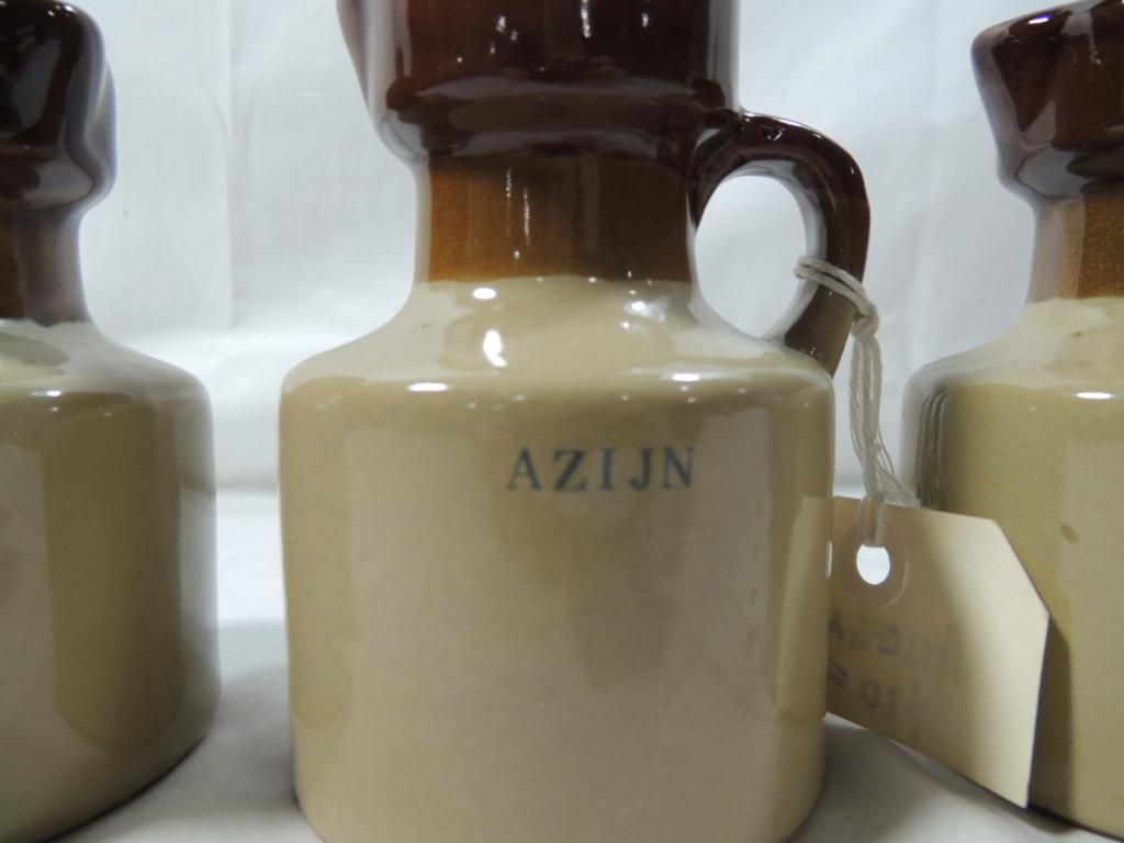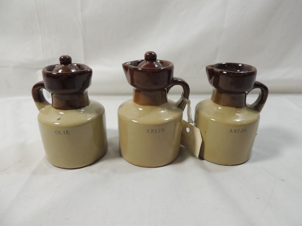 THREE VINTAGE VINEGAR AND OIL MINI JUGS. CERAMIC JUGS. AS SHOWN. SEE PHOTO FOR MORE DETAILS.
