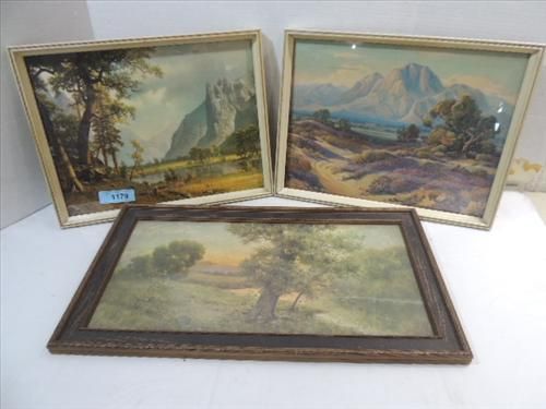 LOT 3 VINTAGE 1930S FRAMED LANDSCAPE PRINTS. NICE QUALTY PRINTS IN ORIGINAL FRAMES. AS SHOWN. VIEW PICTURE FOR DETAIL.