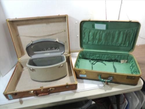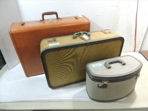 LOT 3 VINTAGE ASSORTED STYLE TRAVEL SUIT CASES. CIRCA 1950S. AS SHOWN. VIEW PICTURE FOR DETAIL.
