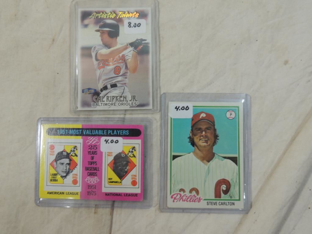 1951 MVP, STEVE CARLTON, CAL RIPKEN JR BASEBALL PLAYER CARDS. TRADING CARDS. COLLECTIBLE. BASEBALL MEMORABILIA. GOOD CONDITION AS SHOWN. SEE PHOTO FOR MORE DETAILS.
