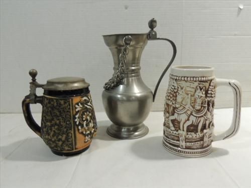 LOT 3 VINTAGE BEER STEINS: ORIGINAL KING, PEWTER TANKARD, AND BRAZILIAN CERAMIC BEER MUG. AS SHOWN. VIEW PICTURE FOR DETAIL.