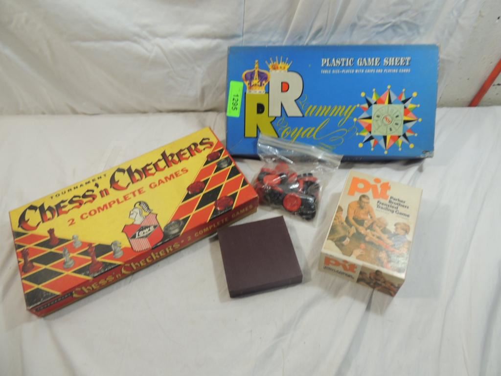 VINTAGE BOARD GAMES, COLLECTIBLE GAMES, RUMMY ROYAL, PIT, CHESS & CHECKERS, AS SHOWN SEE PHOTO FOR MORE DETAILS.