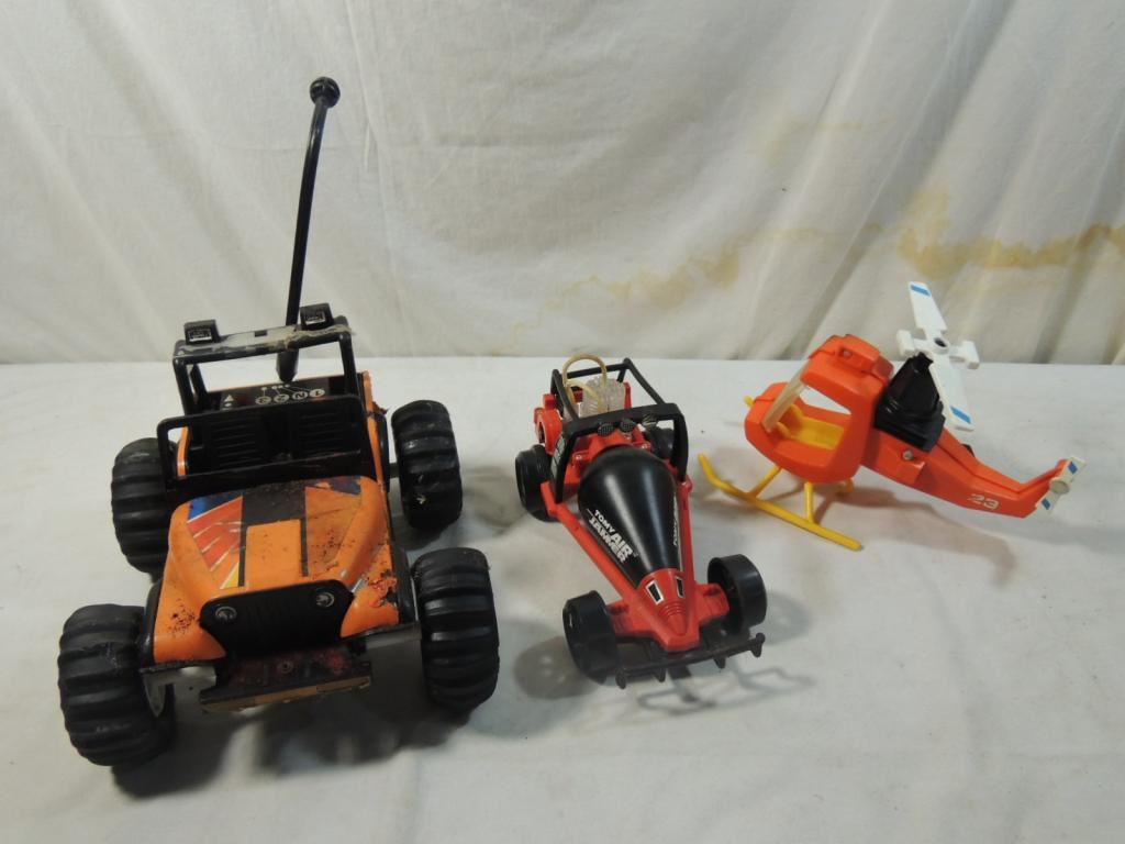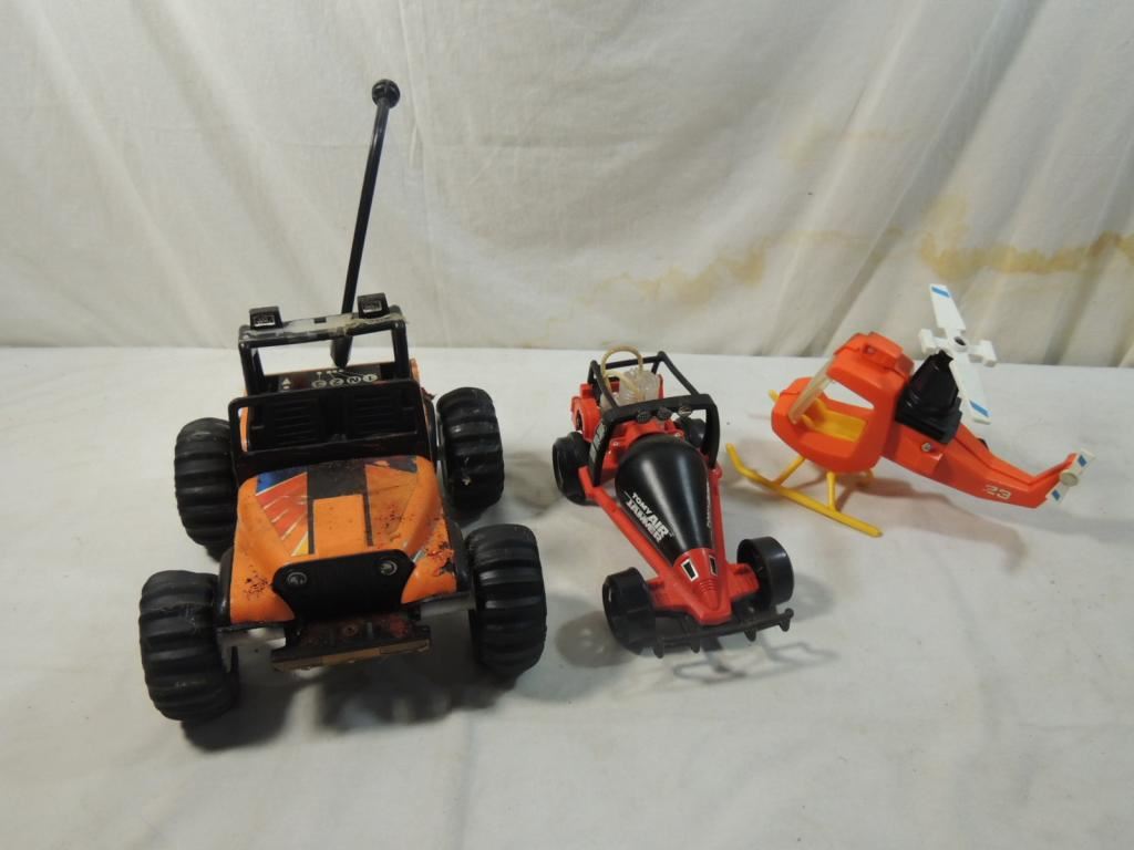 TONKA JEEP, TOMY AIR JAMMER CAR, HELICOPTER VINTAGE VEHICLES, AS SHOWN SEE PHOTO FOR MORE DETAILS.