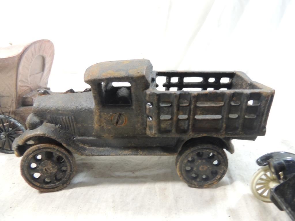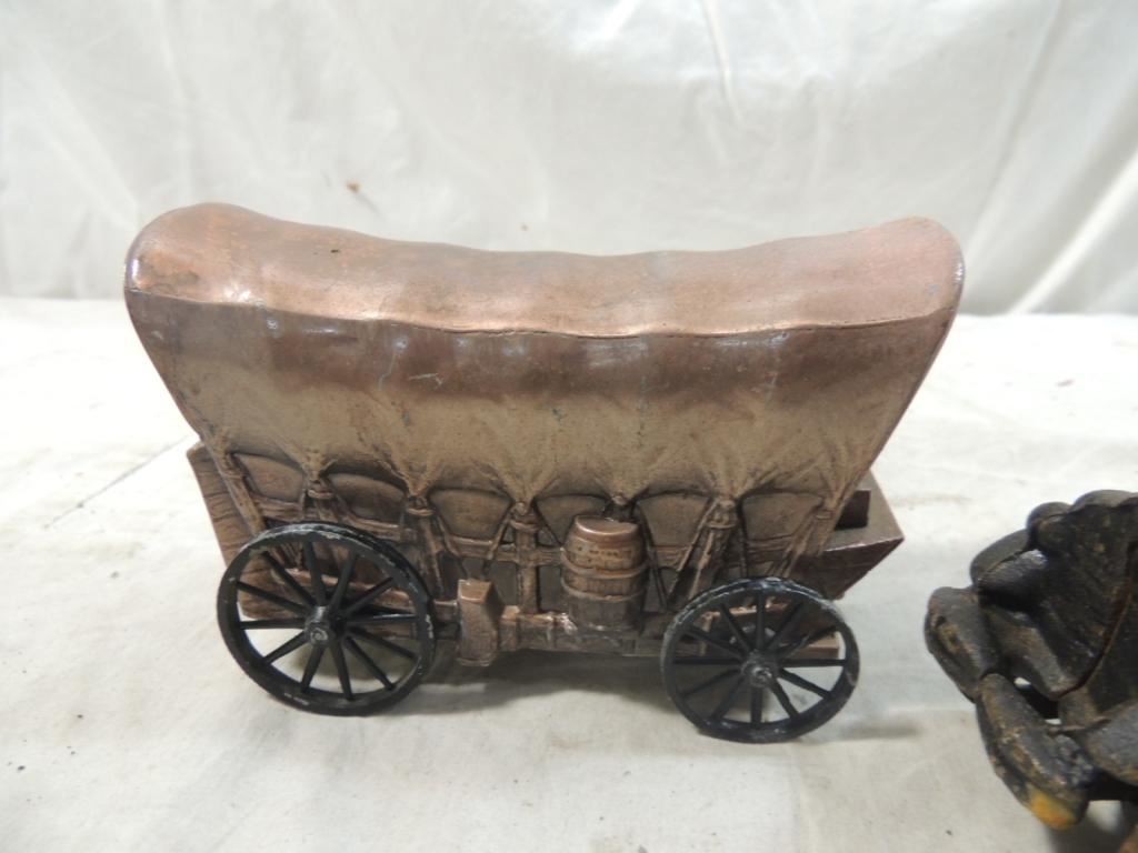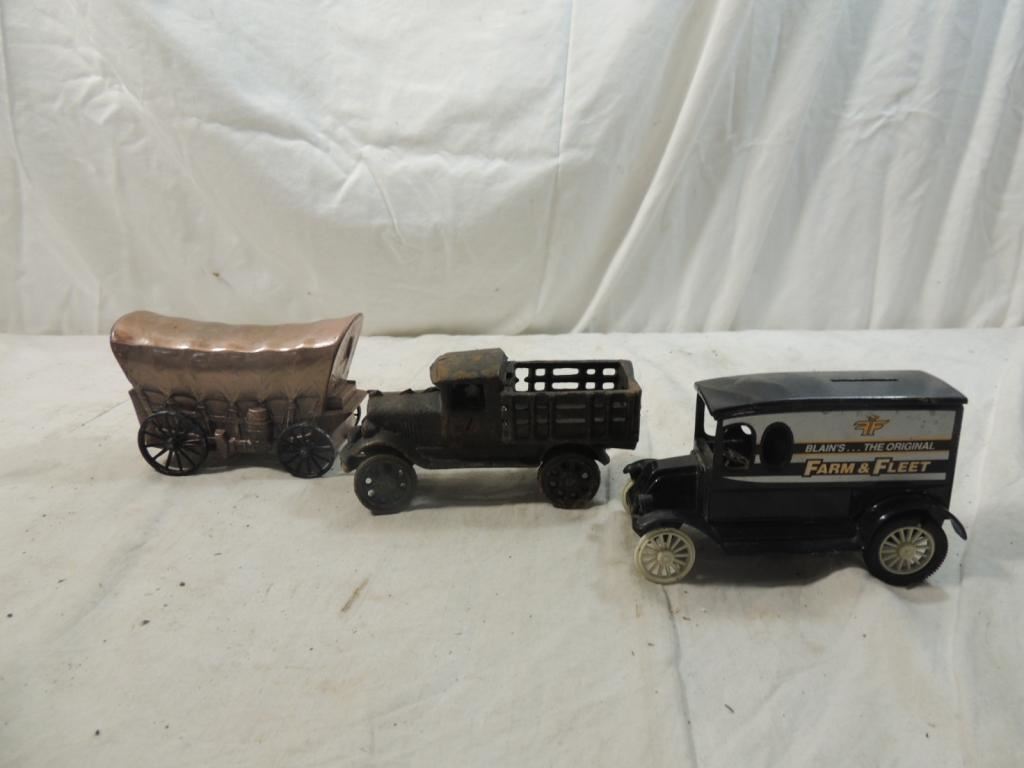 COVERED WAGON, CAST IRON TRUCK, FARM & FLEET BANK, DECORATIVE CARS TRUCKS WAGONS, METAL TRANSPORTATION AS SHOWN SEE PHOTO FOR MORE DETAILS.